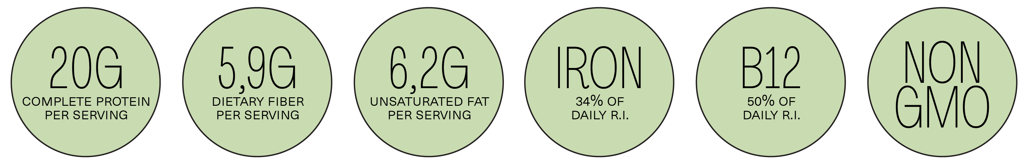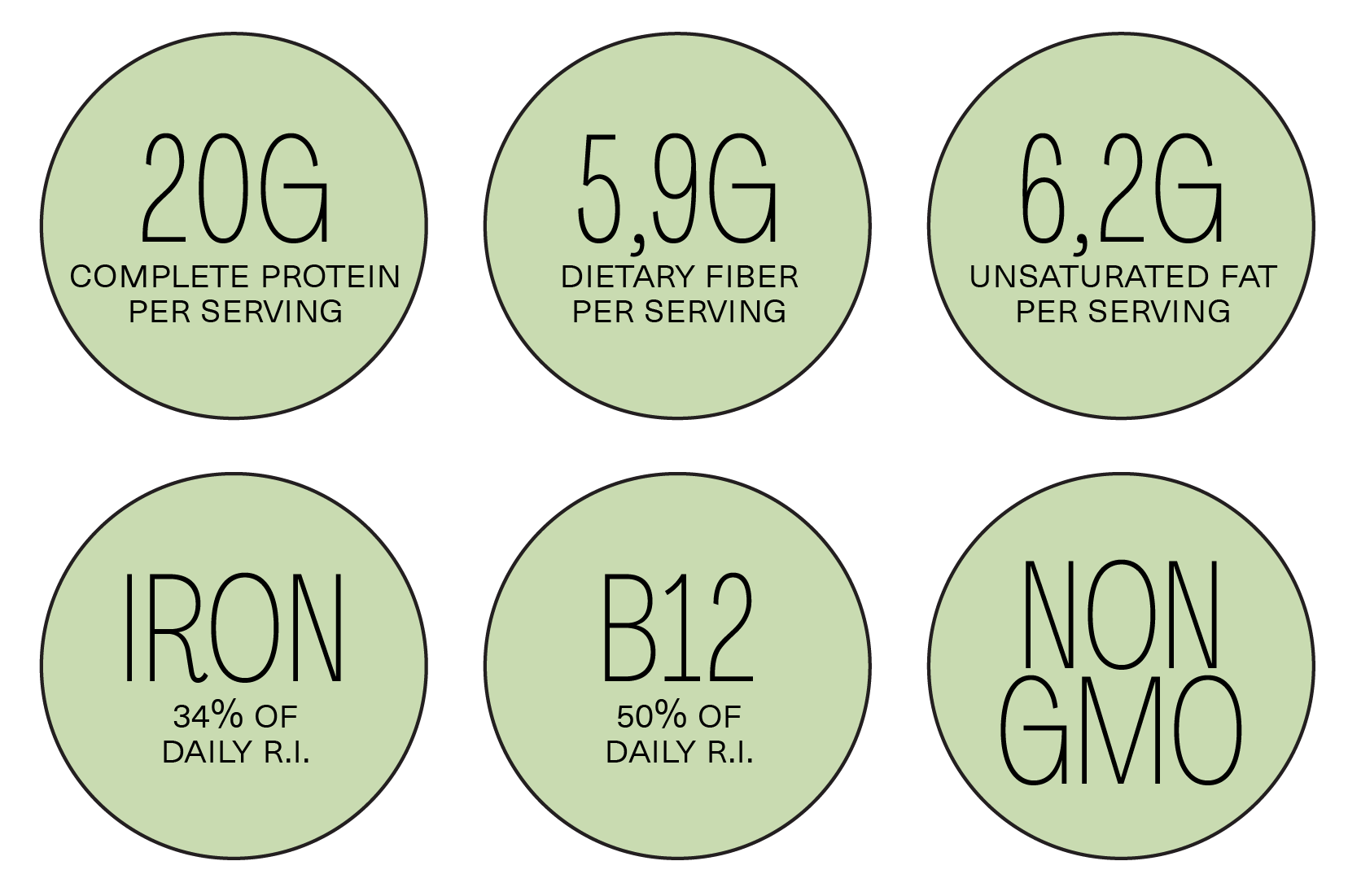 Energy Value 652kJ/156kcal, Total Fat 7.0g (of which saturates 0.8g), Total Carbohydrate 2.4g (of which sugars 0.9g), Dietary Fiber 5.9g, Protein 18g, Salt 0.78g, Iron 4.8mg (34% RI*), Vitamin B12 1.25mcg (50% RI*)